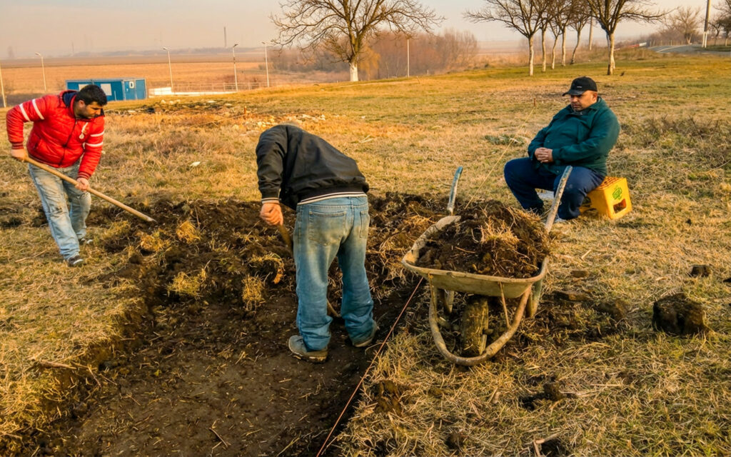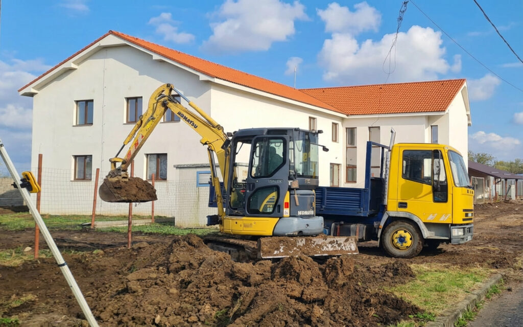 Începe pregătirea pentru construcție: curățarea, nivelarea și delimitarea zonei.